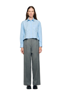 Cropped shirt embellished with rhinestones, featuring a shirt collar, button placket, and patch pocket on the chest. Sandro Women's rhinestone-embellished cropped shirt Shirt collar Button placket Patch pocket on chest Long sleeves with buttoned cuffs Asymmetric shirt hem The model is 5'9 tall and wears a size small