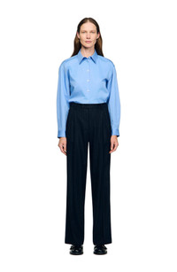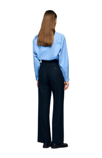 Straight-leg, wide trousers with rhinestone stripes, featuring belt loops and slanting pockets. Sandro Women's straight-leg, wide trousers Rhinestone stripes Button placket fastening Slanting pockets at the front Buttoned welt pockets on the back Ironed creases on front and back The model is 5'9 tall and wears a size 4