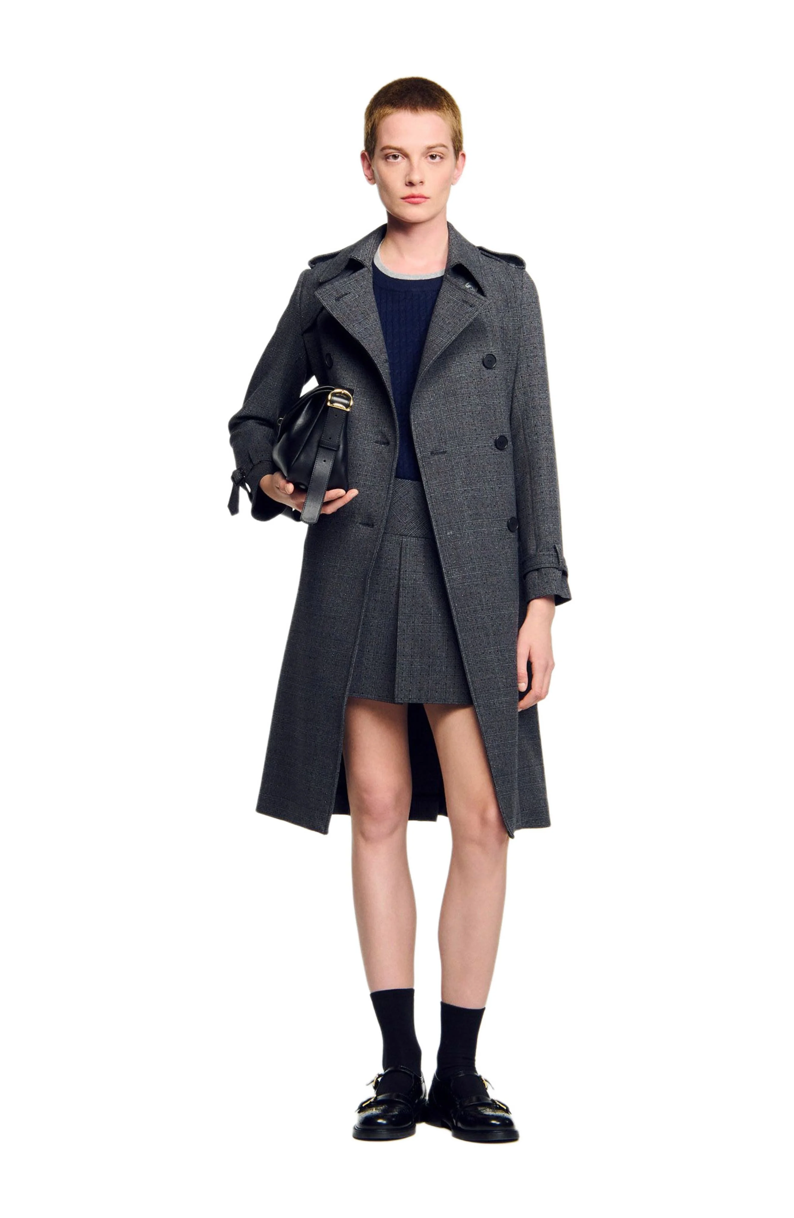 Checked trench coat embellished with rhinestones, with long sleeves, a lapel collar, a storm flap and buttoned tabs on the shoulders and cuffs. Sandro Women's rhinestone checked trench coat Lapel collar Long sleeves Wide welt pockets Storm flap Button fastening at the front Martingale and inverted pleat at the back The model is 5'9 tall and wears a size 4
