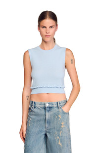 Sleeveless wool and cashmere cropped sweater with ruffle detail at the bottom and a Sandro tag on the chest. These pants match the cardigan Sandro Women's jumper Wool and cashmere blend Ruffled detail SANDRO tag Ribbed neck and waist The model is 5'8 tall and wears a size small