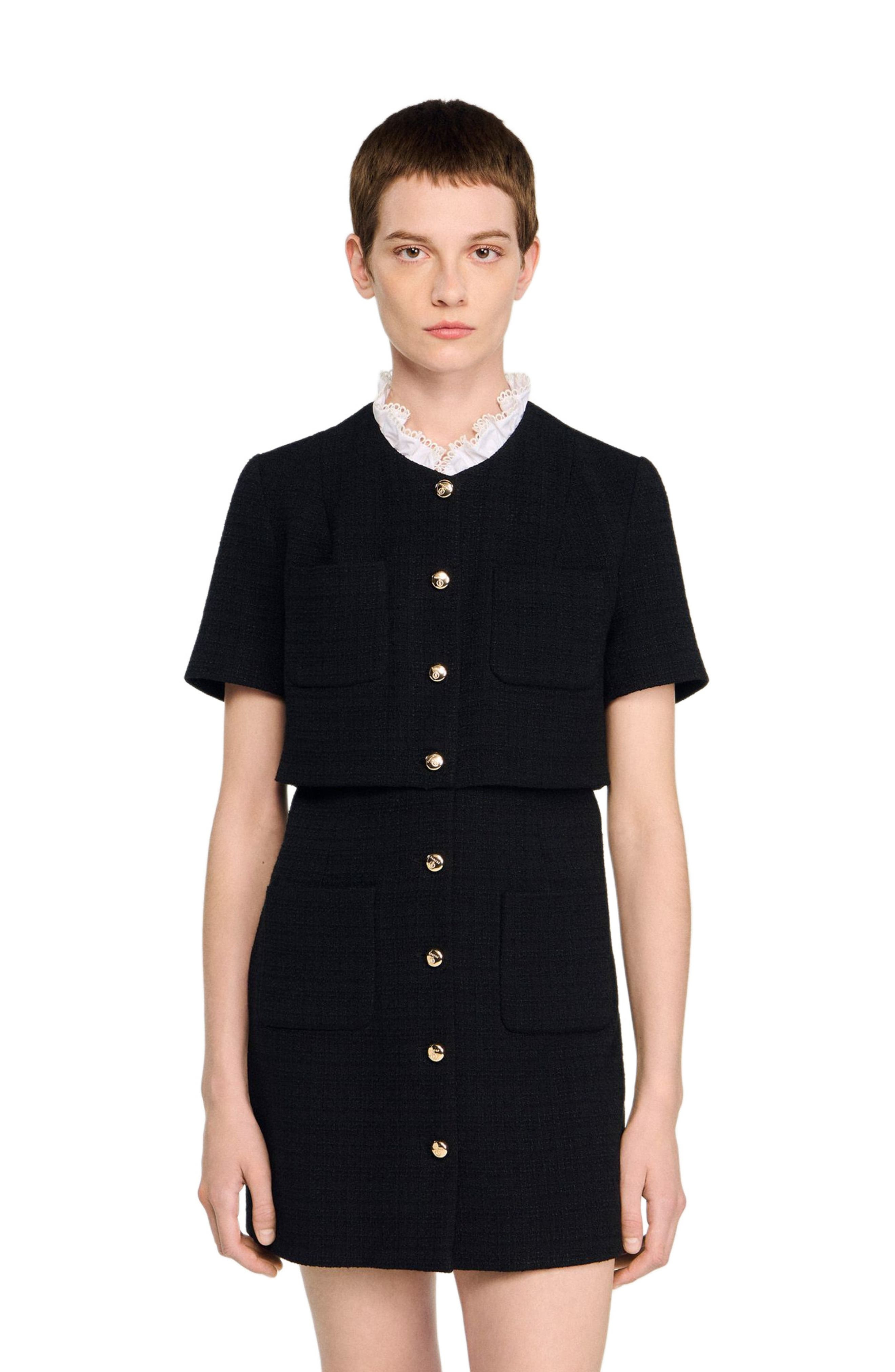 2-in-1 effect short tweed dress with removable contrasting collar, button fastening and patch pockets. Sandro Women's short tweed dress Removable ruffled poplin collar Long sleeves Button placket at the front Patch pockets on chest and skirt The model is 5'9 tall and wears a size 4
