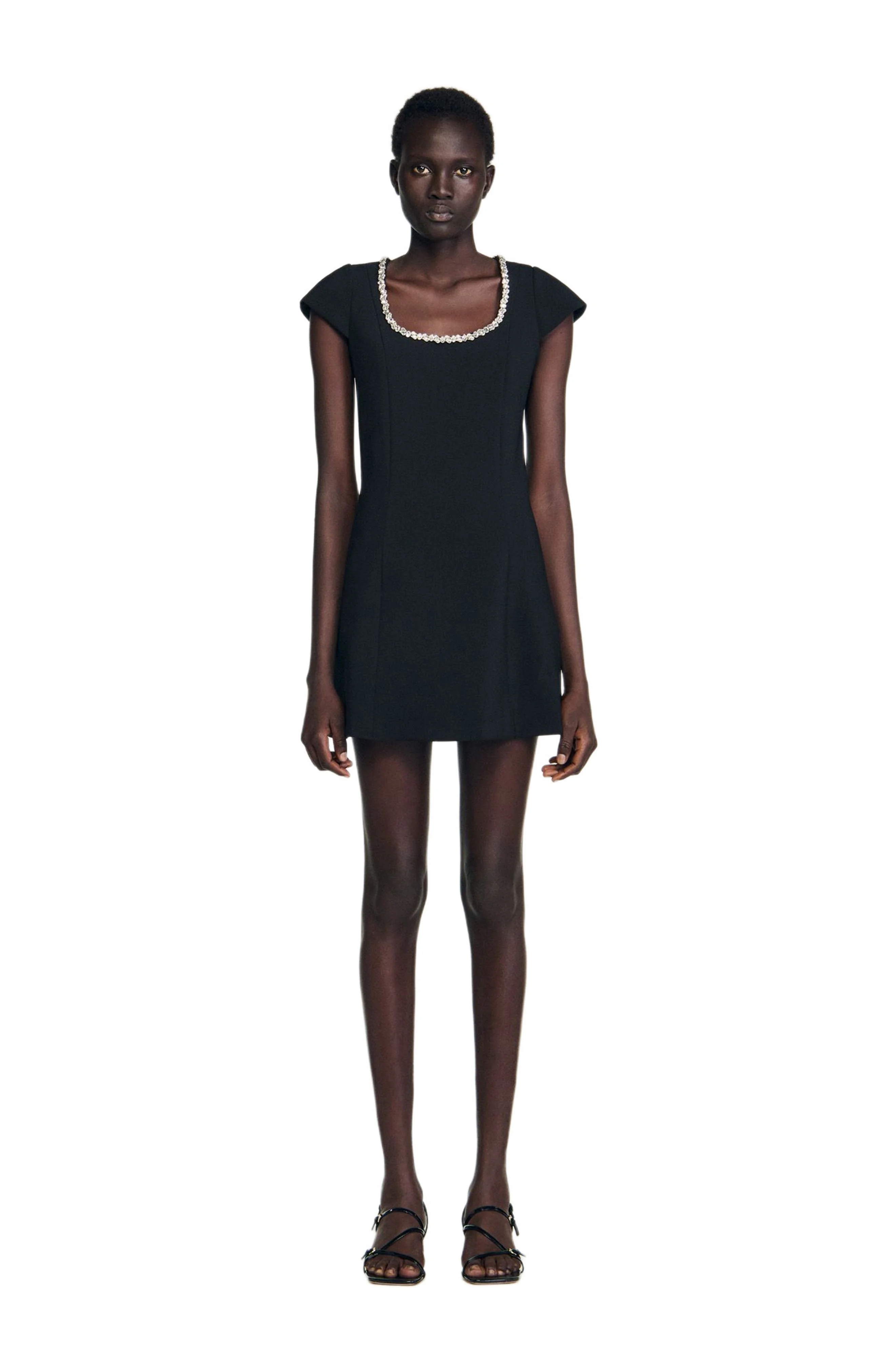 Short dress with a rhinestone-embellished round neckline, featuring short sleeves and a back zip fastening. Sandro Women's short dress Rhinestone-embellished neckline Round neck Short sleeves Princess seams Fitted top and flared bottom The model is 5'9 tall and wears a size 4