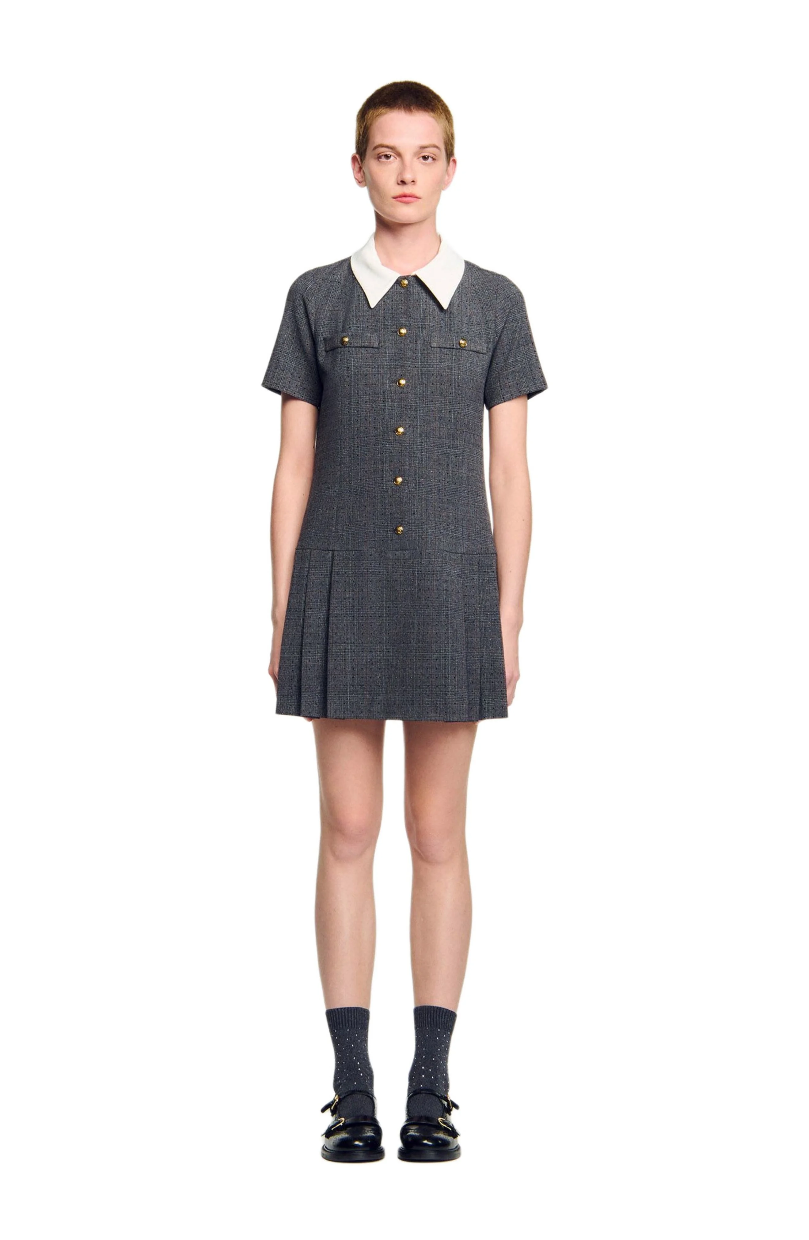 Short checked dress embellished with rhinestones, featuring short sleeves, a removable contrasting collar and buttoned mock welt pockets at the chest. Sandro Women's short checked dress Removable contrasting collar Short sleeves Buttoned mock welt pockets The model is 5'9 tall and wears a size 4