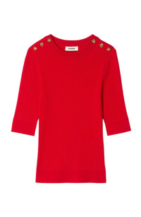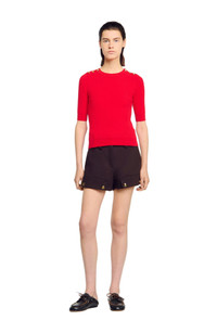 Rib knit sweater with round neck, short sleeves and embellished with a button placket on the shoulder. Sandro Women's cable knit jumper Slim fit Round neck Short sleeves Shoulder button placket with decorative buttons The model is 5'8 tall and wears a size small