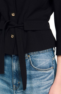 Short belted jacket with a topstitched lapel collar, long sleeves, and welt flap pockets. Sandro Women's short jacket Fitted Topstitched lapel collar Removable belt with belt loops at the waist Welt pockets with flaps The model is 5'8 tall and wears a size 36