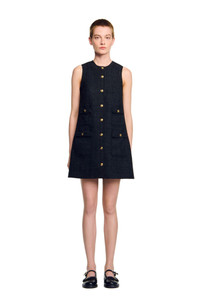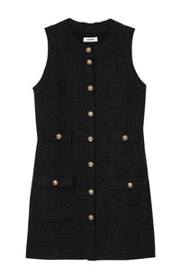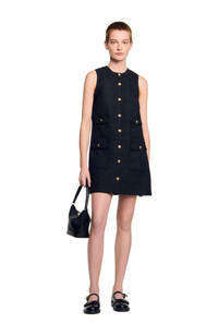 Short sleeveless tweed dress with round neckline, button fastening and patch pockets with flaps. Sandro Women's short tweed dress Shift dress Round neck Sleeveless Button fastening with gold buttons Flap pockets The model is 5'8 tall and wears a size 4