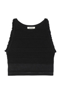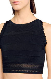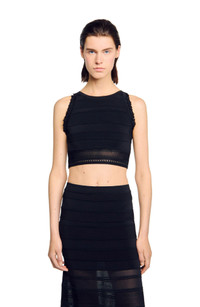 Sleeveless cropped sweater in a decorative knit, with a round neck and ruffled trim on the armholes. This sweater matches the skirt Sandro Women's decorative knit cropped jumper Round neck Sleeveless Ruffled trim The model is 5'9 tall and wears a size small