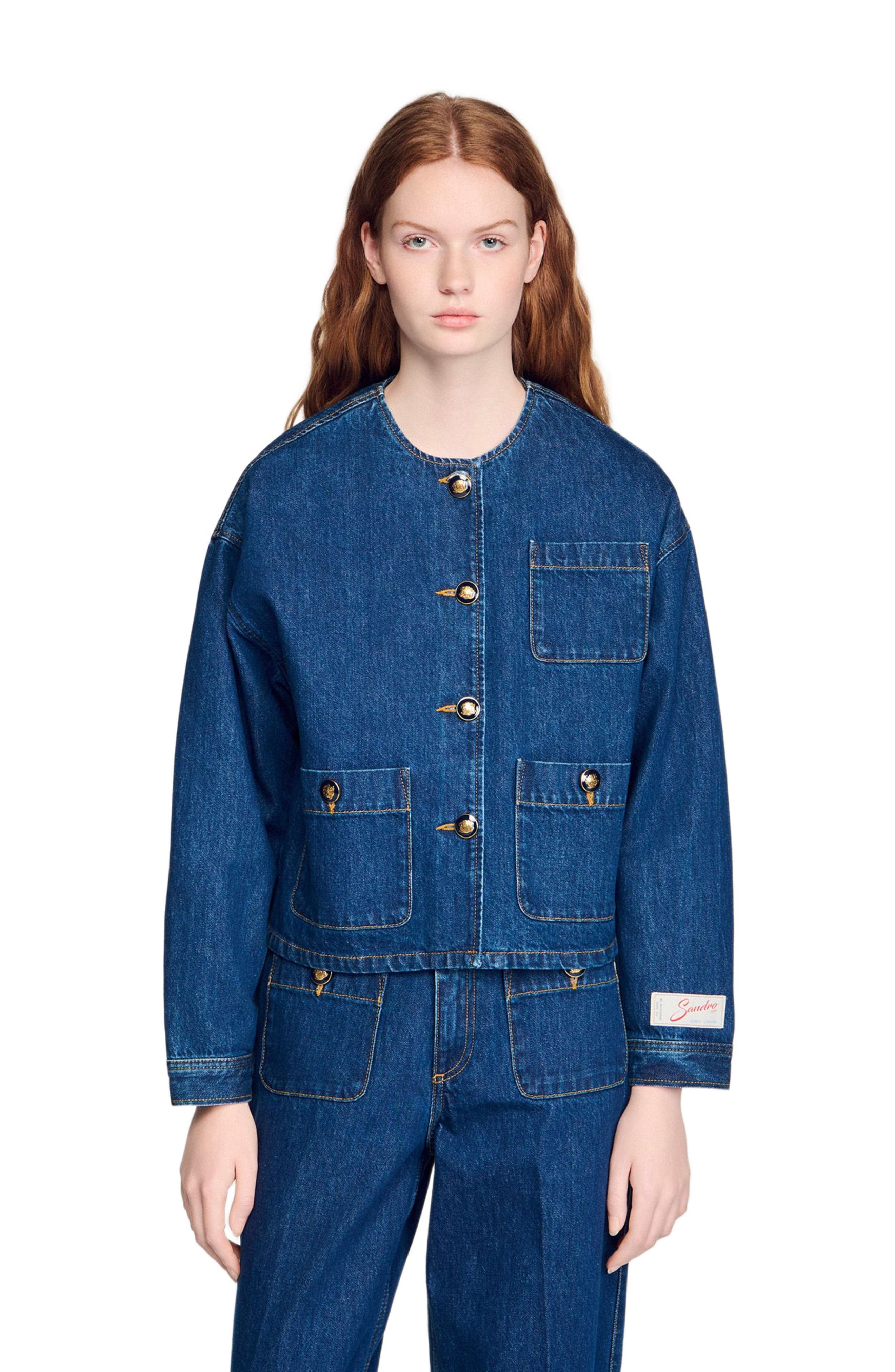 Straight-cut raw denim jacket with a round neck, long sleeves and a decorative button fastening. Sandro Women's denim jacket Straight cut Round neck Long sleeves with buttoned cuffs Front button fastening with decorative metal buttons Small patch pocket on the chest and two patch pockets on the hips 100% cotton The model is 5'11 tall and wears a size 4