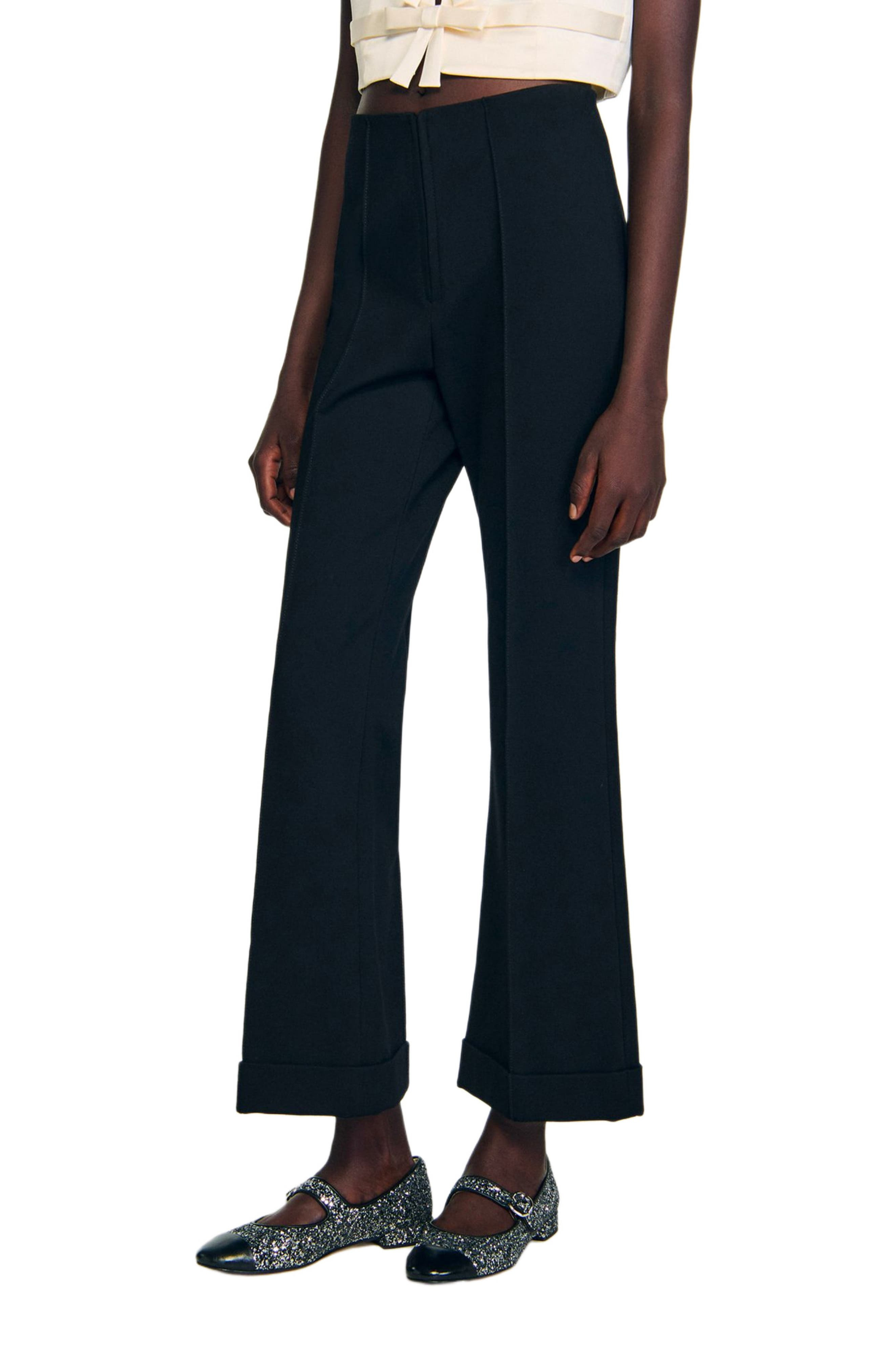 Straight-leg heavy jersey trousers with a high waist and front zip fastening. Sandro Women's straight-leg trousers High waist Topstitched zip at the front Pin tuck pleats at the front and back Wide turn-up hems The model is 5'9 tall and wears a size 4