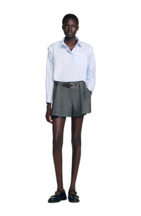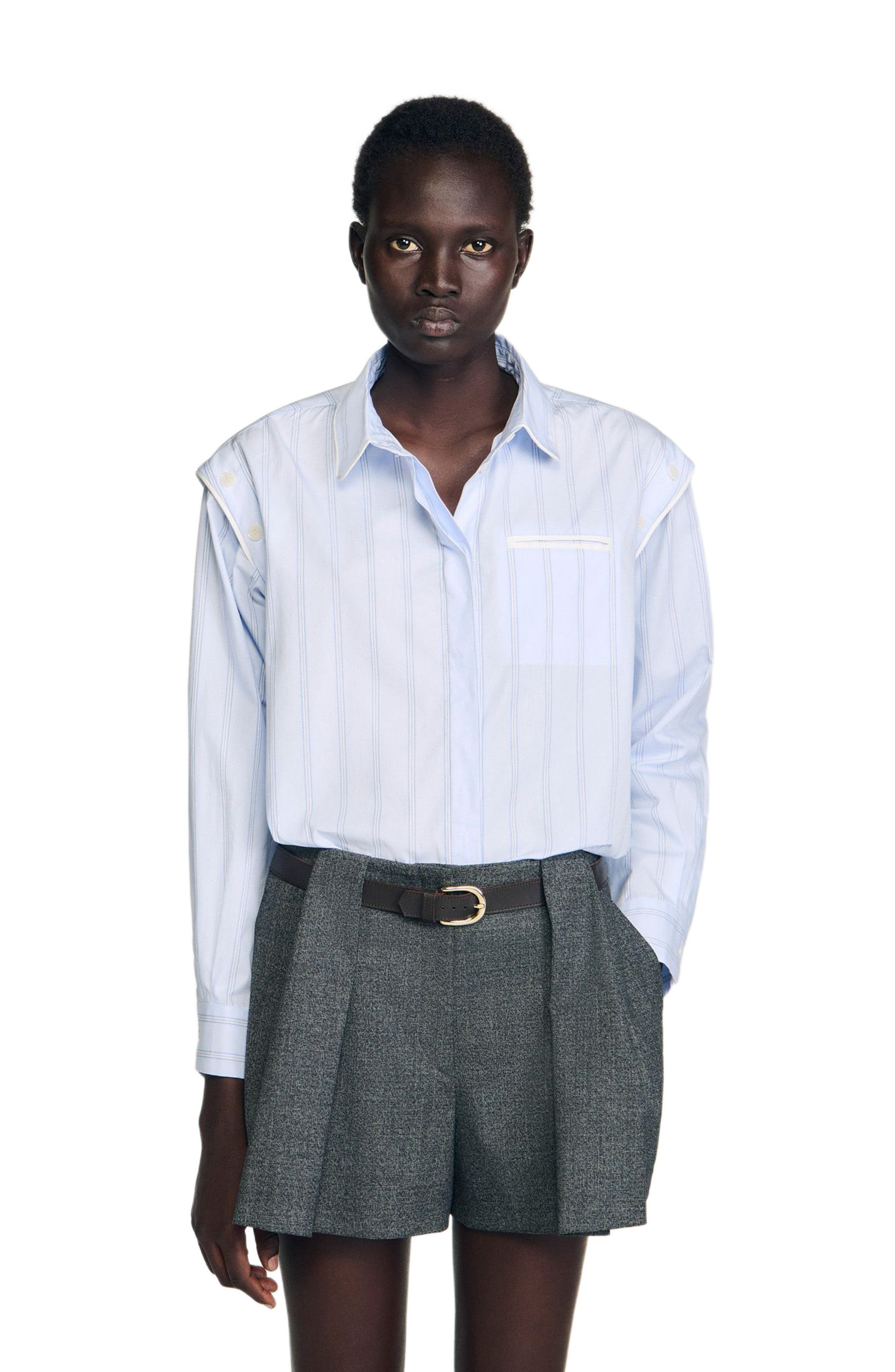 Striped shirt with contrasting edges, featuring a slightly rounded shirt collar, hidden button placket, and shoulder buttons to reveal the shoulders. Sandro Women's striped shirt Slightly rounded shirt collar Shoulder buttons Hidden button placket Piped pocket with contrasting trim Long sleeves with buttoned cuffs Asymmetric shirt hem The model is 5'9 tall and wears a size small