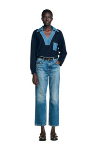 Fine knit sweater with long sleeves, featuring a contrasting V-neck and patch pocket in denim. Sandro Women's fine knit jumper Straight cut Long sleeves Denim collar and pocket Ribbed edges The model is 5'8 tall and wears a size small