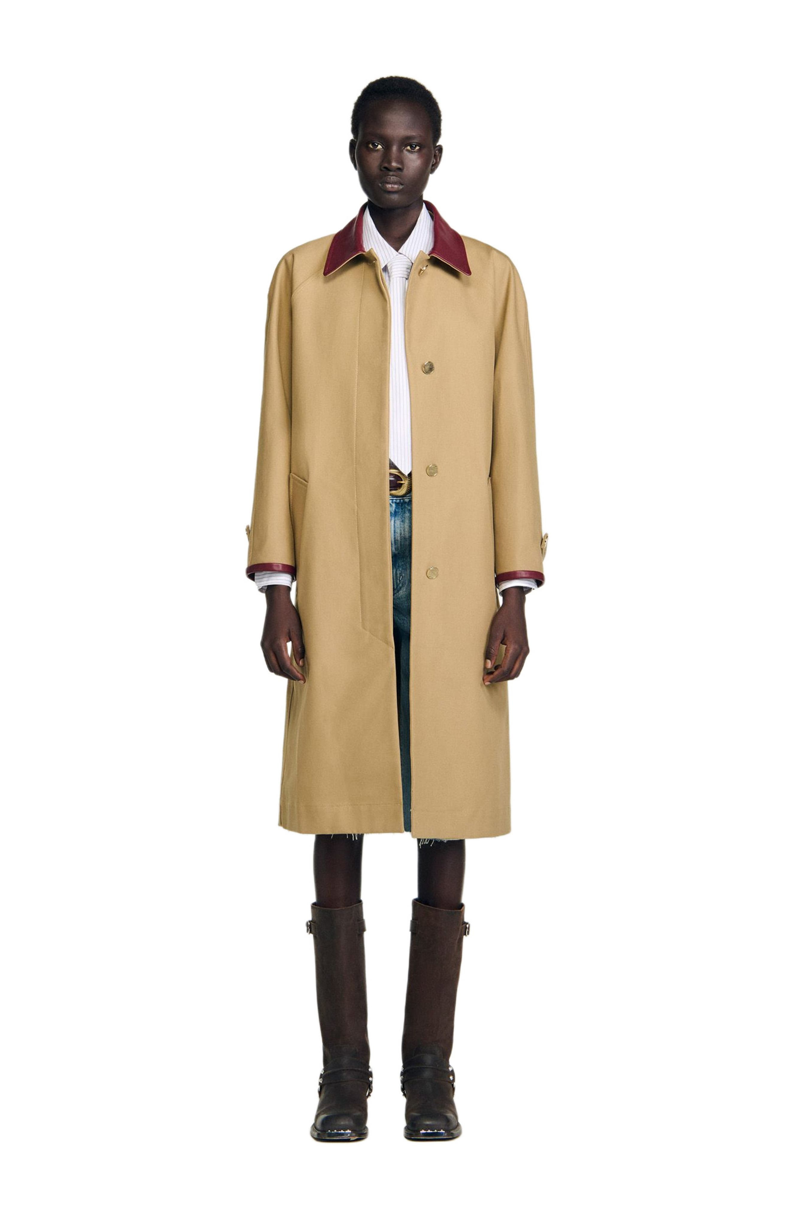 Long trench coat with leather collar and cuffs, long sleeves, front pockets and button fastening with covered placket. Sandro Women's long trench coat Contrasting leather collar and cuffs Button fastening with covered placket Long sleeves 2 pockets The model is 5'9 tall and wears a size 4