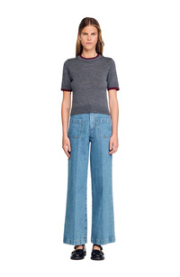 Short fine knit sweater with round neck and short sleeves with contrasting trim, adorned with a signature tag. Sandro Women's short knit jumper Round neck Short sleeves Double contrasting trim Ribbed edges The model is 5'8 tall and wears a size small