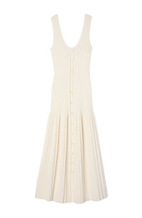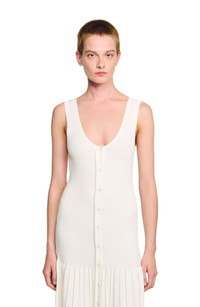Long knit dress with straps, a press-stud fastening and a flared pleated-effect skirt. Sandro Women's long knit dress Thin straps Flared pleated-effect skirt Front button fastening The model is 5'9 tall and wears a size 36