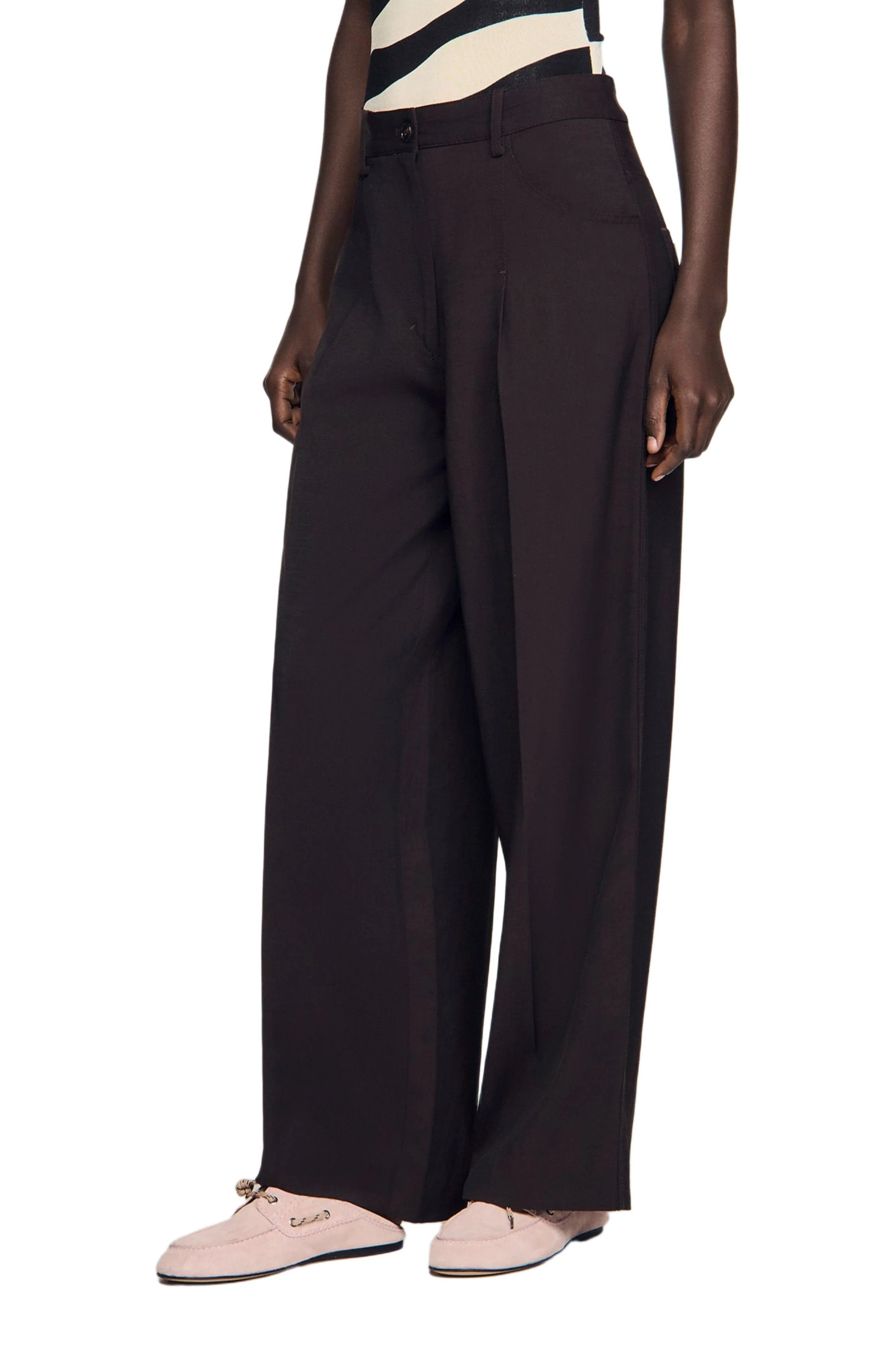 Plain high-waisted wide-leg trousers with a button front fastening. Sandro Women's wide-leg trousers Wide and long cut Button fly at the front Belt loops Jean-style front pockets and patch pockets on the back Pressed creases down the centre of the leg The model is 5'11 tall and wears a size 4