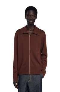 Wool trucker sweater with front zip fastening and a funnel neck. Sandro Men's fine knit trucker jumper Classic fit 100% wool Funnel neck Long sleeves The model is 6'2 tall and wears a size M