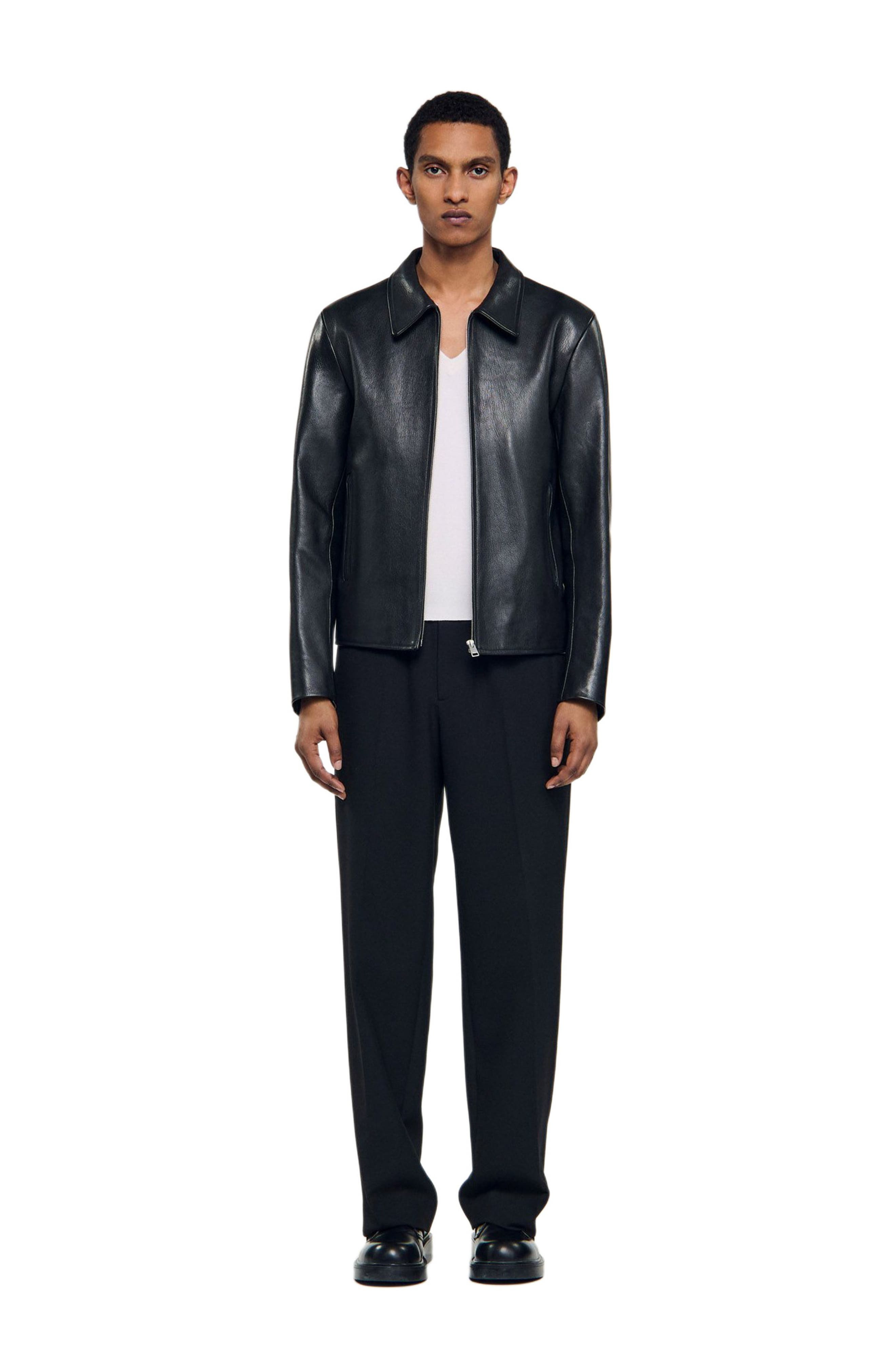 Goatskin leather jacket with wing collar, zip fastening, long sleeves with cuffs and piped pockets. Sandro Men's leather jacket Classic fit Wing collar Long sleeves with zip cuffs Zip fastening Piped pockets The model is 6'1 tall and wears a size M