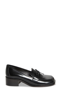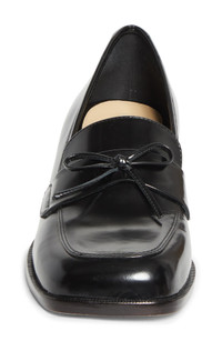 A block heel and dainty bow updated a prepster-classic loafer fashioned in a square-toe silhouette from glossy spazzolato leather. 1 1/2" (39mm) heel Leather upper, lining and sole Made in Brazil Designer Shoes Asian & Pacific Islander Owned/Founded