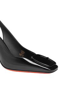 The very essence of feminine attitude, expressed through Santoni's signature aesthetic codes. This shoe recounts the brand's unique universe with an iconic double-buckle detail and a sculptural silhouette with square toe and trapeze heel. Crafted from shiny patent leather, this elegant style is elevated with an elasticated slingback strap. Women’s slingback Crafted from patent leather Colour: black Square toe Enamelled buckle-shaped detail Strap with elasticated insert 8.5 cm block heel Leather sole Printed Santoni logo on the insole Made in Italy