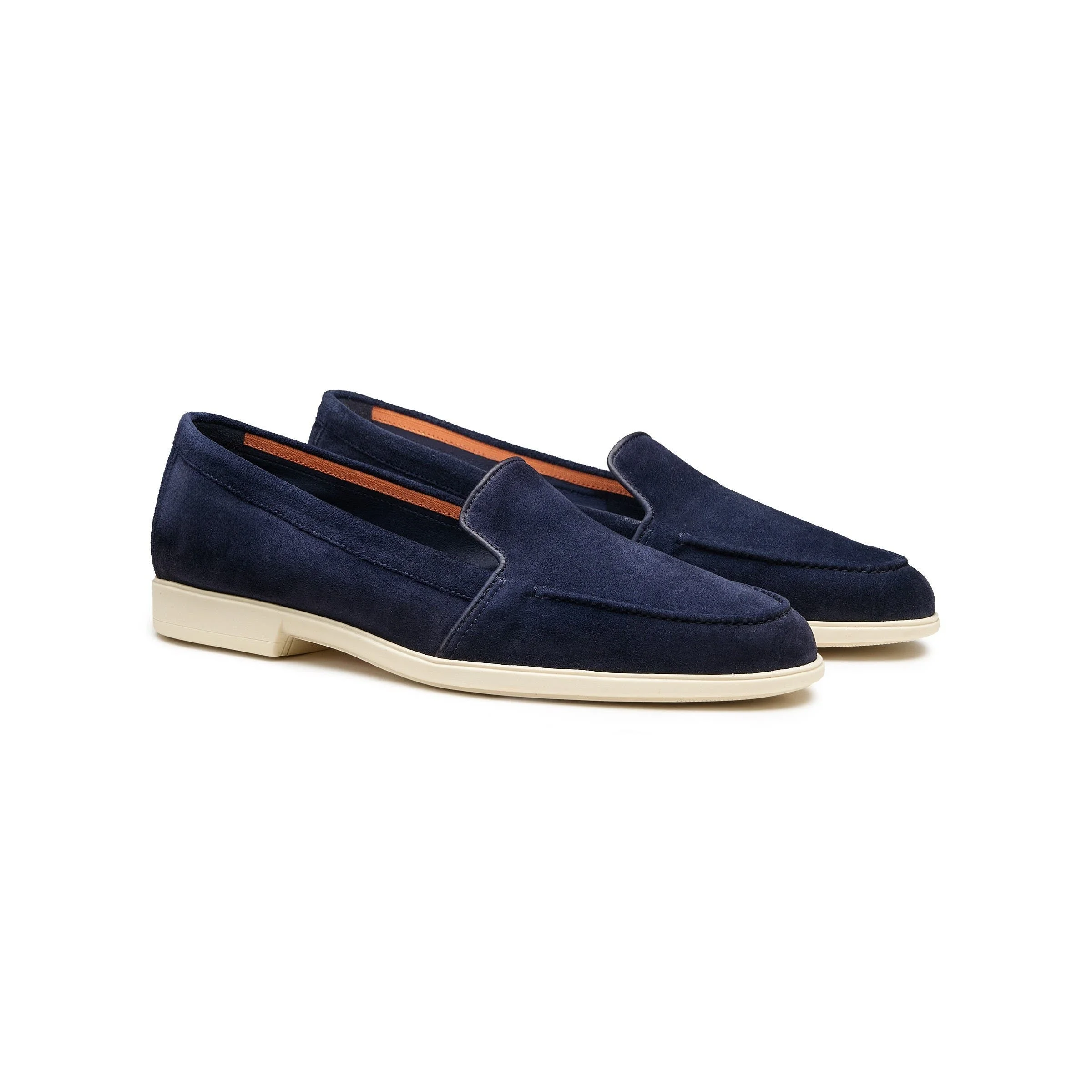 The sleek, unassuming lines of the loafer rewrite every look with fine materials and sophisticated artisanal workmanship. Embracing the foot like silk for an elevated sensory experience with every stride, this supple Seta suede iteration is treated with Santoni's artisanal Velatura color-graded finish and hallmarked with a Sigillo stitch in Arancio Santoni — the Maison's signature orange. A rubber sole ensures comfort and stability from morning to night, elevated with a distinctive detail that recalls the lines of Santoni's iconic double buckle. Crafted from Seta suede Treated with Santoni’s Velatura color-graded finish Apron stitching Classic silhouette with round toe Arancio Santoni Sigillo stitch Rubber sole Arancio Santoni double-buckle detail on the tread Printed Santoni logo on the insole Made in Italy
