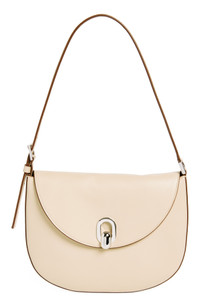 A polished, sculptural lock secures the flap of this subtly curved calfskin bag named after the Italian Renaissance word for circular art. Slip-bar flap closure Adjustable shoulder strap Interior wall pocket Leather Made in Italy Designer Handbags