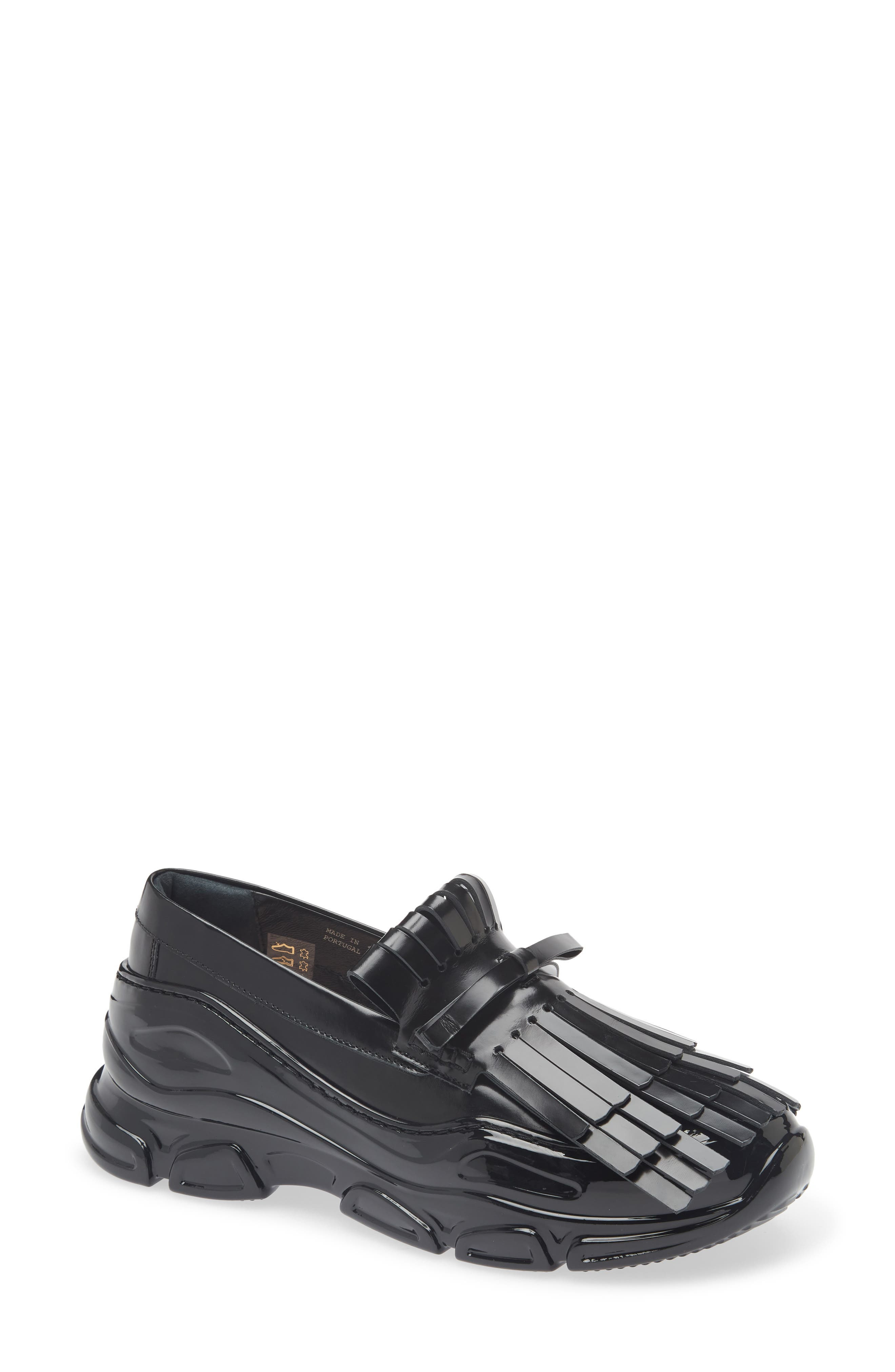 Kiltie fringe topped with a signature bow bring prepster style to this glossy leather loafer grounded on a chunky sneaker-inspired sole with toothy tread. Leather upper and lining/synthetic sole Made in Portugal Designer Shoes Asian & Pacific Islander Owned/Founded