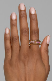 Ombre pink sapphires sparkle at the center of this handcrafted set of rings that stack 18-karat gold bands linked with loops so it can be worn spread across the fingers. Total sapphire weight: 1.40ct. 18k gold/pink sapphire Made in the USA