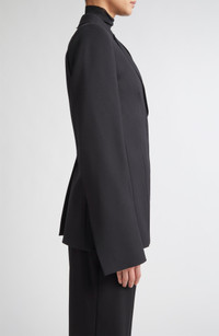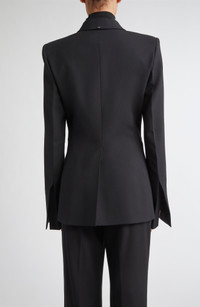 A double-breasted silhouette with concealed buttons lends an asymmetric effect to this peaked-lapel blazer tailored from wool stretch gabardine. Split cuffs complete the polished look. Hidden-button double-breasted closure Peaked lapels Split cuffs Chest welt pocket; front flap pockets Lined 95% virgin wool, 5% elastane Dry clean Imported Designer Clothing