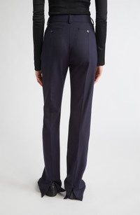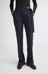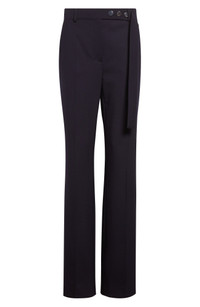 A study in striking contrasts, these trousers bring virgin wool tailoring to life with flowing movement and bold details. The flared hem nods to retro style, while the draped belt detail punctuated by gleaming hardware introduces a utilitarian accent. Zip fly with hook-and-bar closure Front slant pockets; back button-welt pockets 100% virgin wool Dry clean Imported Designer Clothing