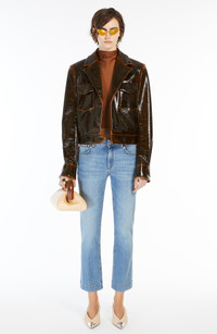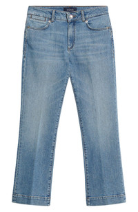 Trouser-style creases lend a polished look to crop jeans fashioned in a slight flare-leg silhouette of dark-wash stretch denim. Zip fly with button closure Five-pocket style 99% cotton, 1% elastane Machine wash, dry flat Made in Turkey Designer Clothing