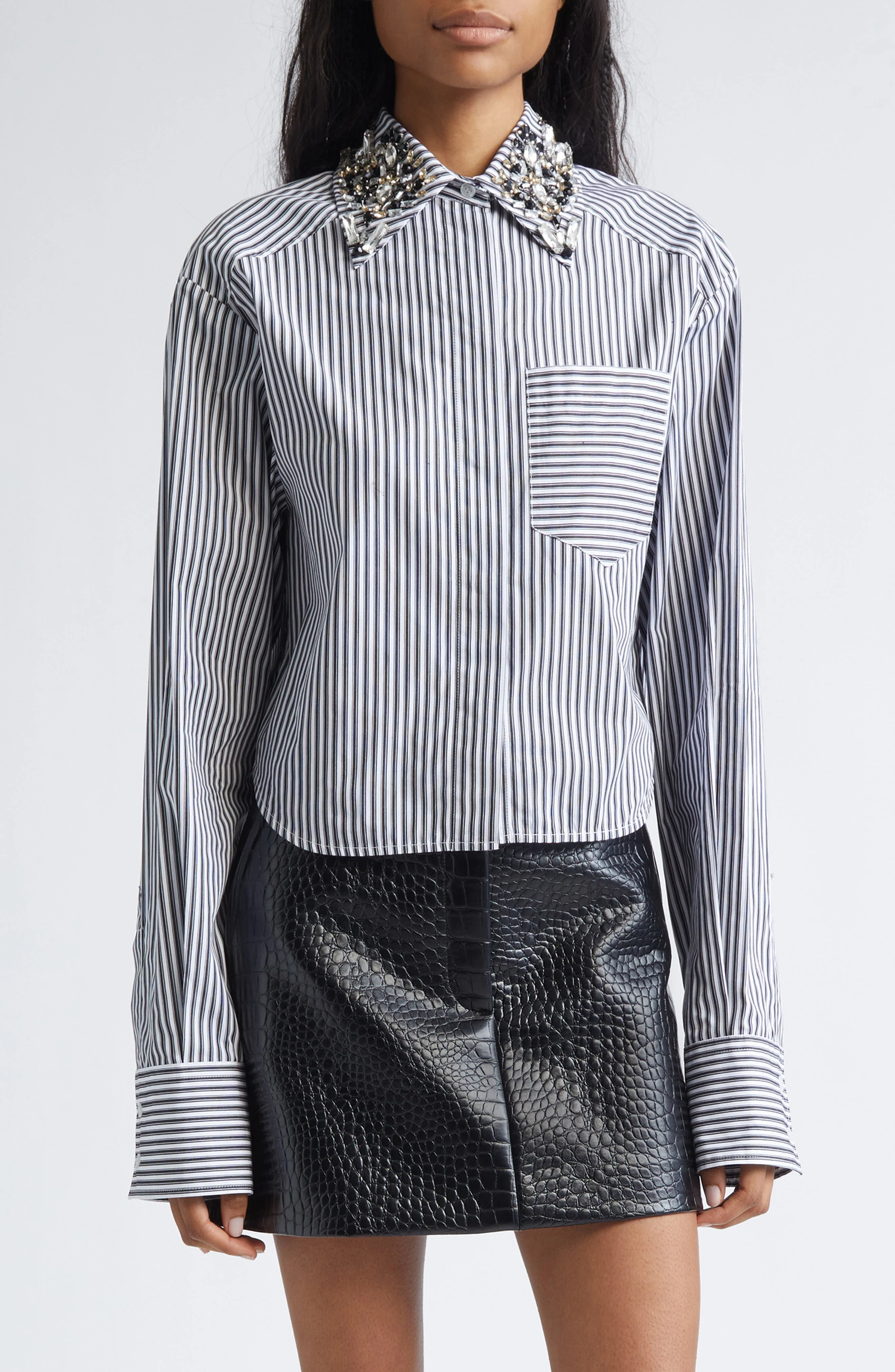 A glittering assortment of chunky jewels adorns the collar of this crisp cotton shirt cut with deep cuffs and mixed-direction stripes at the pocket. Hidden-button placket Spread collar Long sleeves with two-button cuffs Chest patch pocket 100% cotton Dry clean or hand wash, line dry Imported Designer Clothing