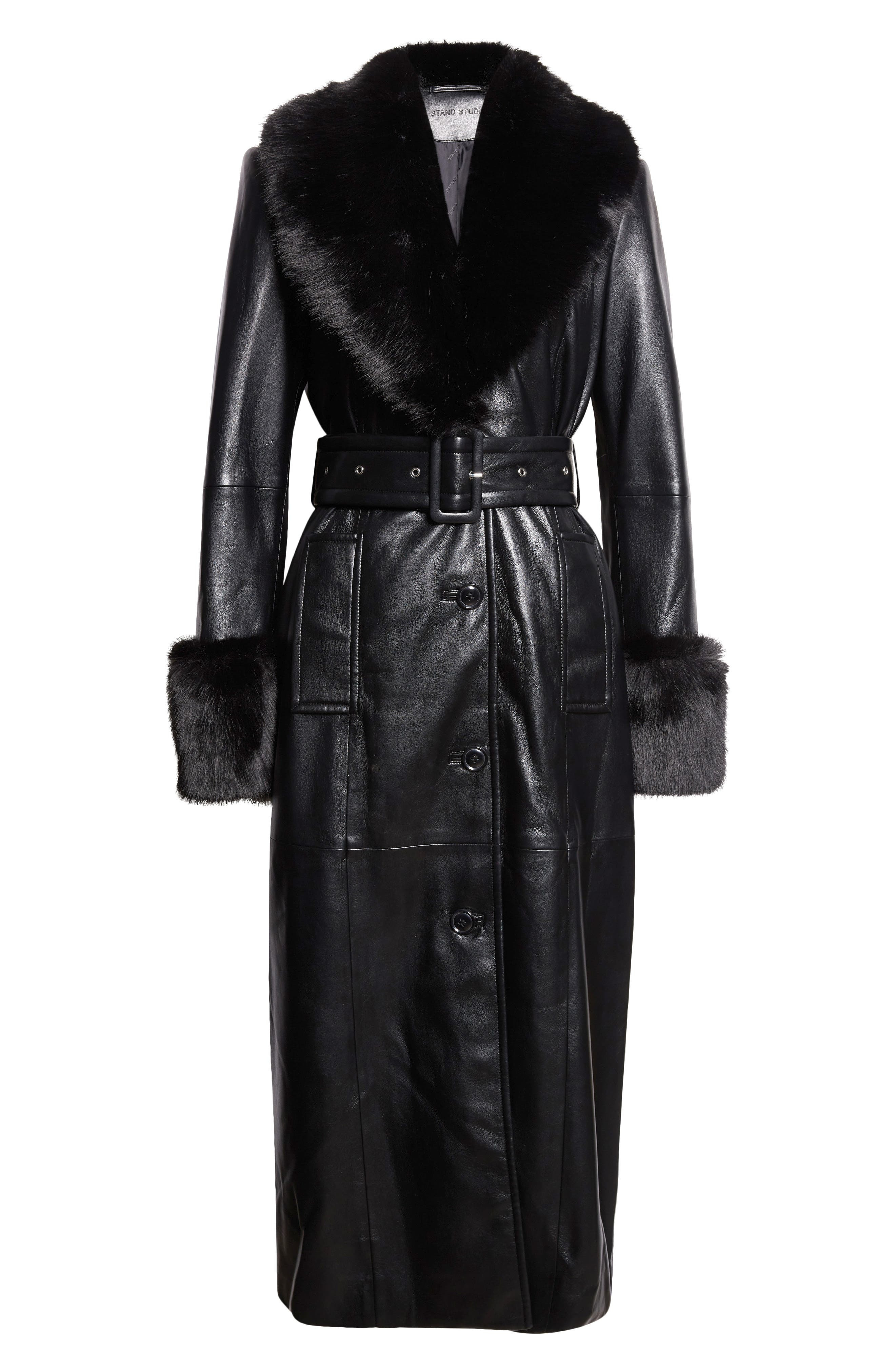 Stand Studio Estella Belted Faux Leather Coat with Faux Fur Trim in Black/Black at Nordstrom