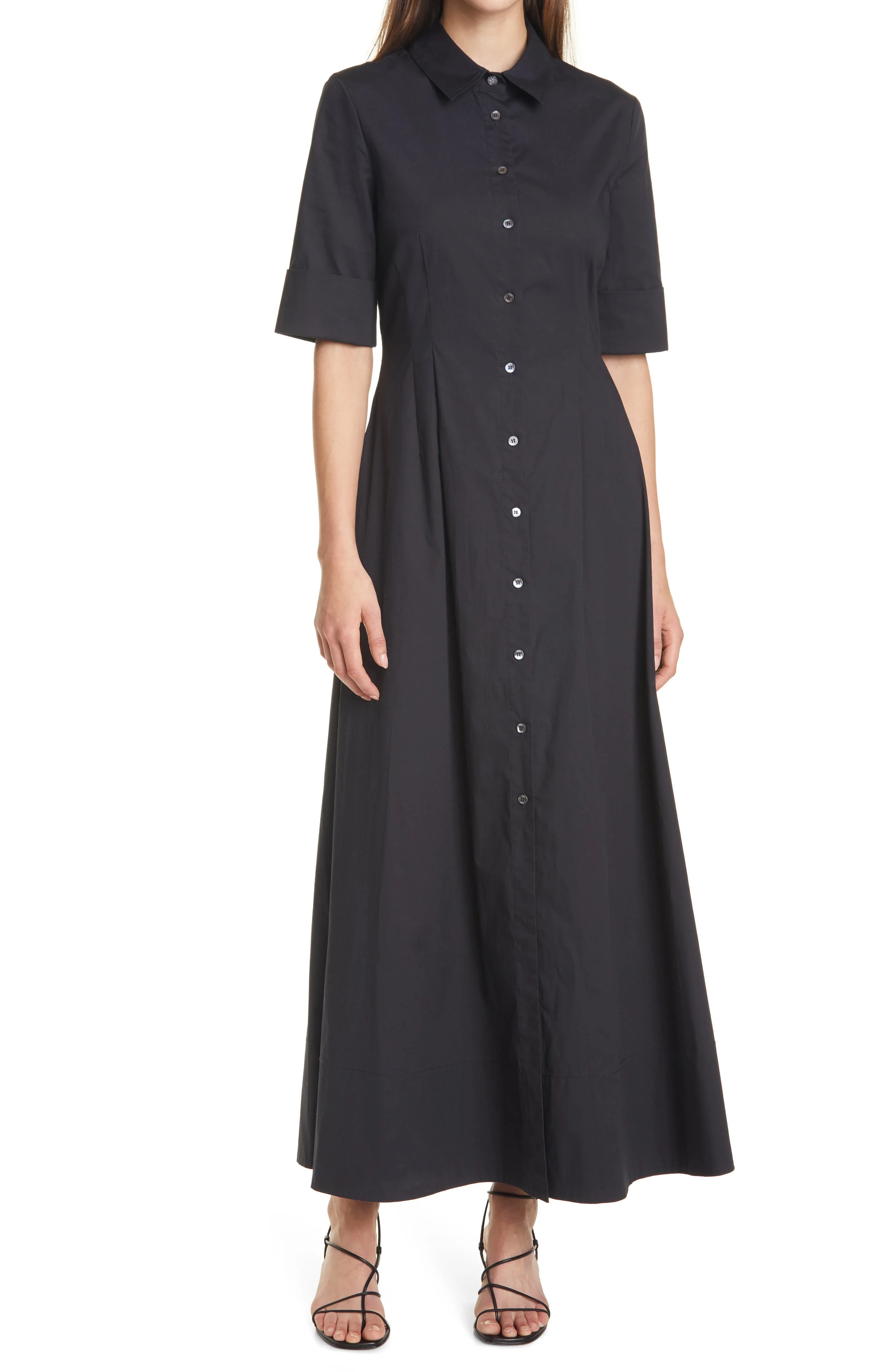 A tailored maxi shirtdress in crisp, stretch cotton features princess seams for a close fit through the bodice and a full, flared skirt. 57" length (size 8) Front button closure Spread collar Elbow-length sleeves 98% cotton, 2% spandex Dry clean or machine wash, tumble dry Imported Women's Clothing