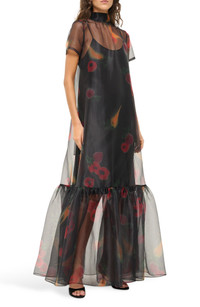 Serve up the drama in this organza-overlay maxi dress styled with a ruffled hem and drapey ties trailing down the open back. Ties at neck Mock neck Short sleeves Slip lining 100% polyester Dry clean Imported