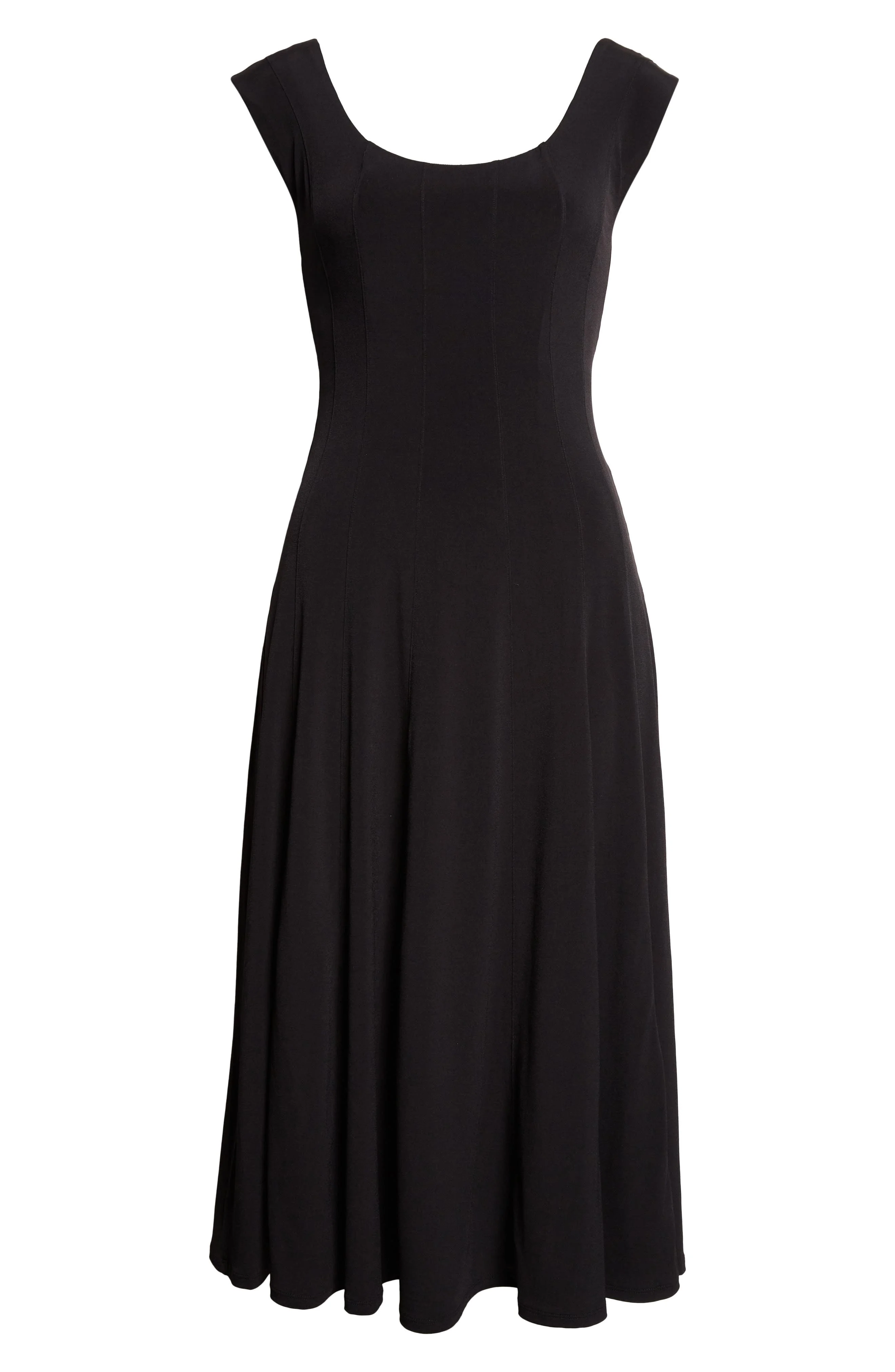 Slight sleeves frame this soft jersey midi made with a fitted bodice and finished with a flowy flared skirt. Scoop neck Cap sleeves Lined 95% polyester, 5% spandex Dry clean Imported