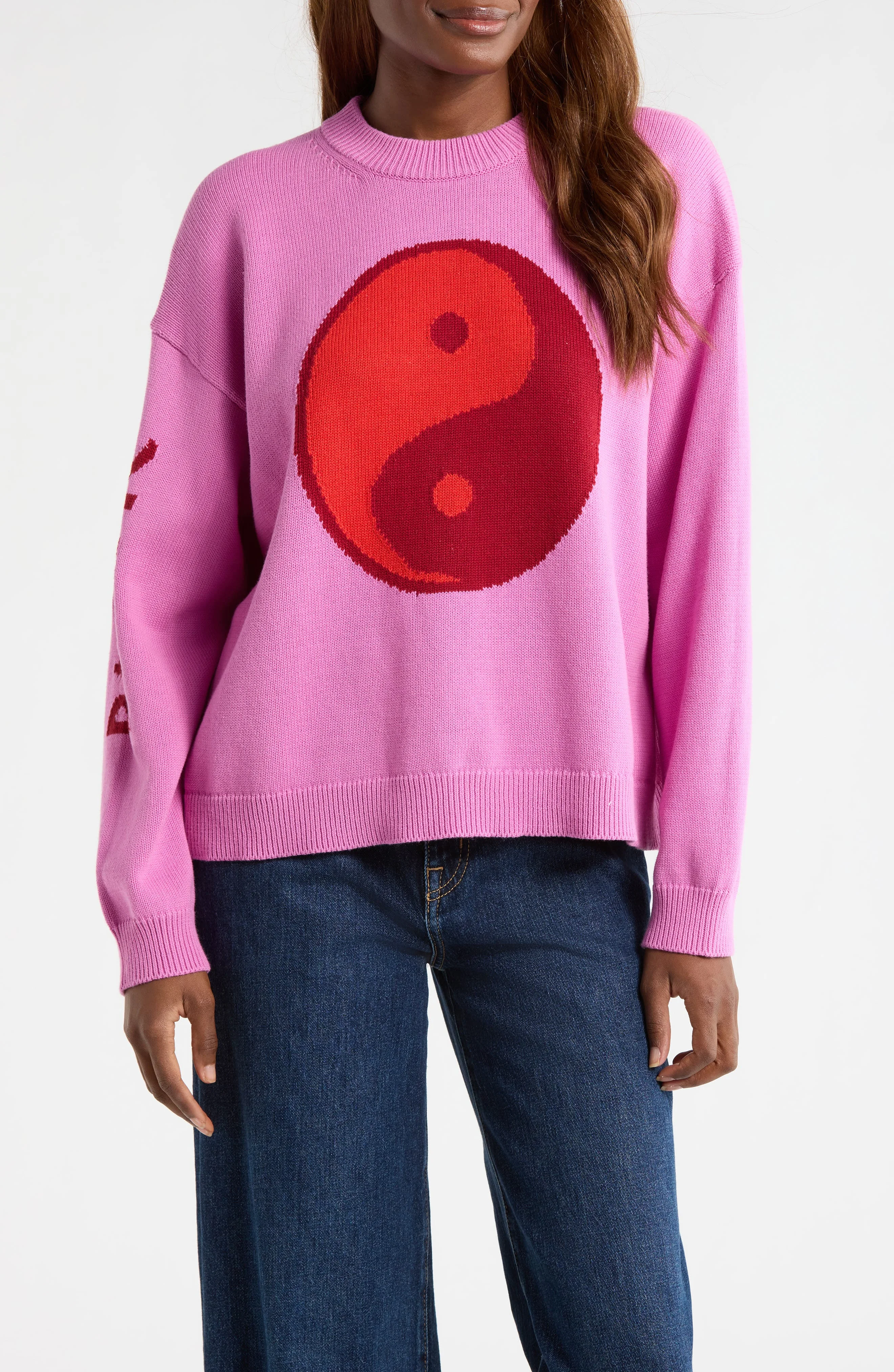 Bring a bold pop of color to your sweater-weather rotation with this oversized pullover knit from soft cotton yarns and emblazoned with a fiery yin-yang symbol. Crewneck Long sleeves Dropped shoulders Ribbed cuffs and hem 100% cotton Dry clean Imported