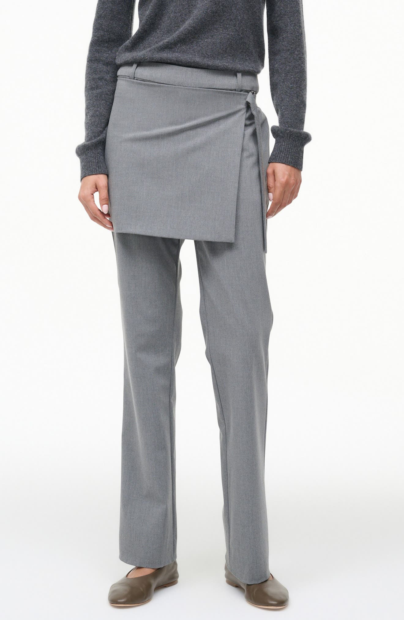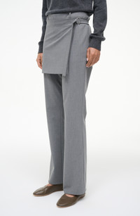 Traditional wool-kissed pants play with the form by adding a miniskirt-inspired panel to the front. Back-welt pockets Lined 62% polyester, 26% viscose, 6% wool, 6% spandex Dry clean Imported