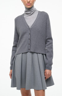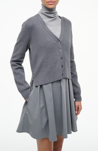 The classic combo of a cardigan and pleated skirt is recreated in this perfectly preppy mixed-media dress. Turtleneck base layer sold separately Front button closure V-neck Long sleeves Top is 95% cotton, 5% cashmere; skirt is 49% polyester, 36% rayon, 8% wool, 7% spandex Dry clean Imported