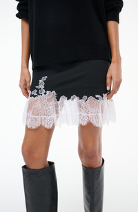Romantic white lace stands out on this satin miniskirt that adds flirty, lingerie-inspired charm to any look you pair it with. 49% polyester, 36% viscose, 8% wool, 7% elastane; 100% polyester Machine wash, line dry Imported