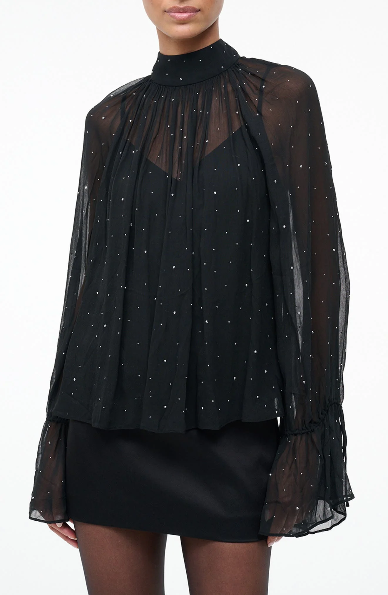 Rival the night sky in a star-splashed top cut from sheer fabric and ruffled at the sleeve cuffs. Back keyhole with tie closure High neck Long sleeves with tie cuffs Lined 100% viscose Dry clean Imported