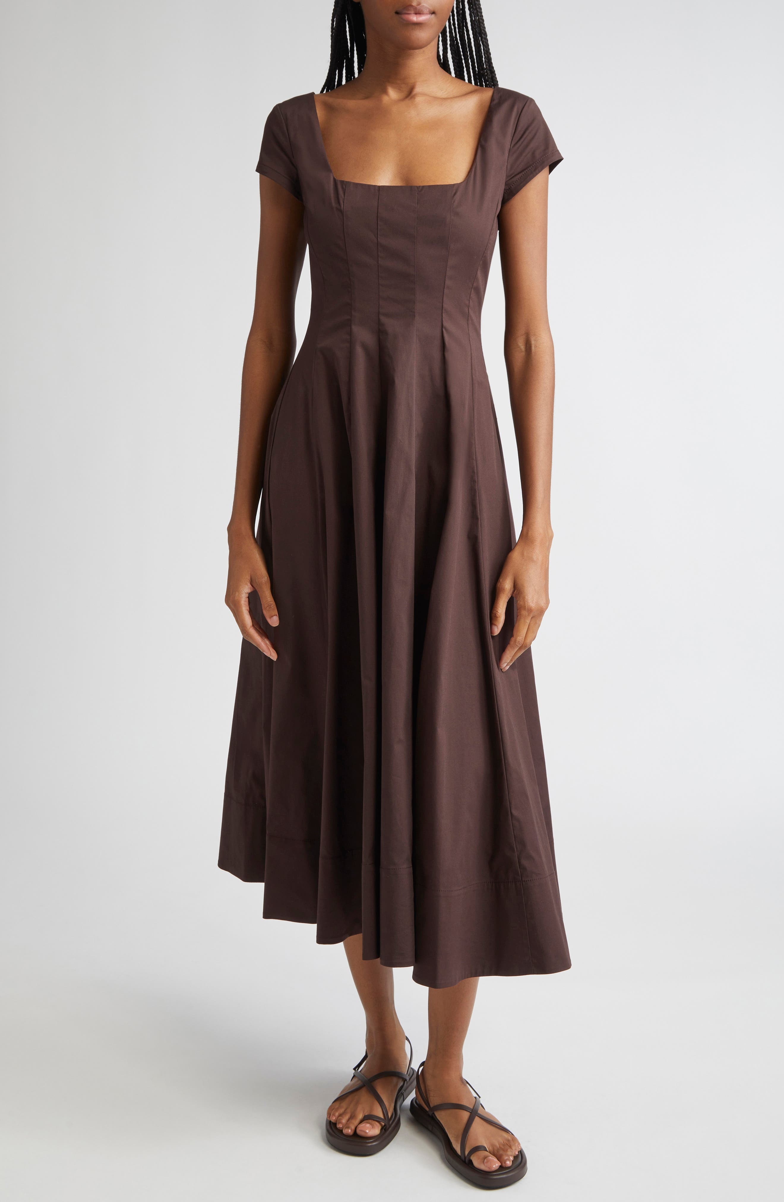 STAUD Wells Short Sleeve Stretch Cotton Midi Dress in Earth at Nordstrom