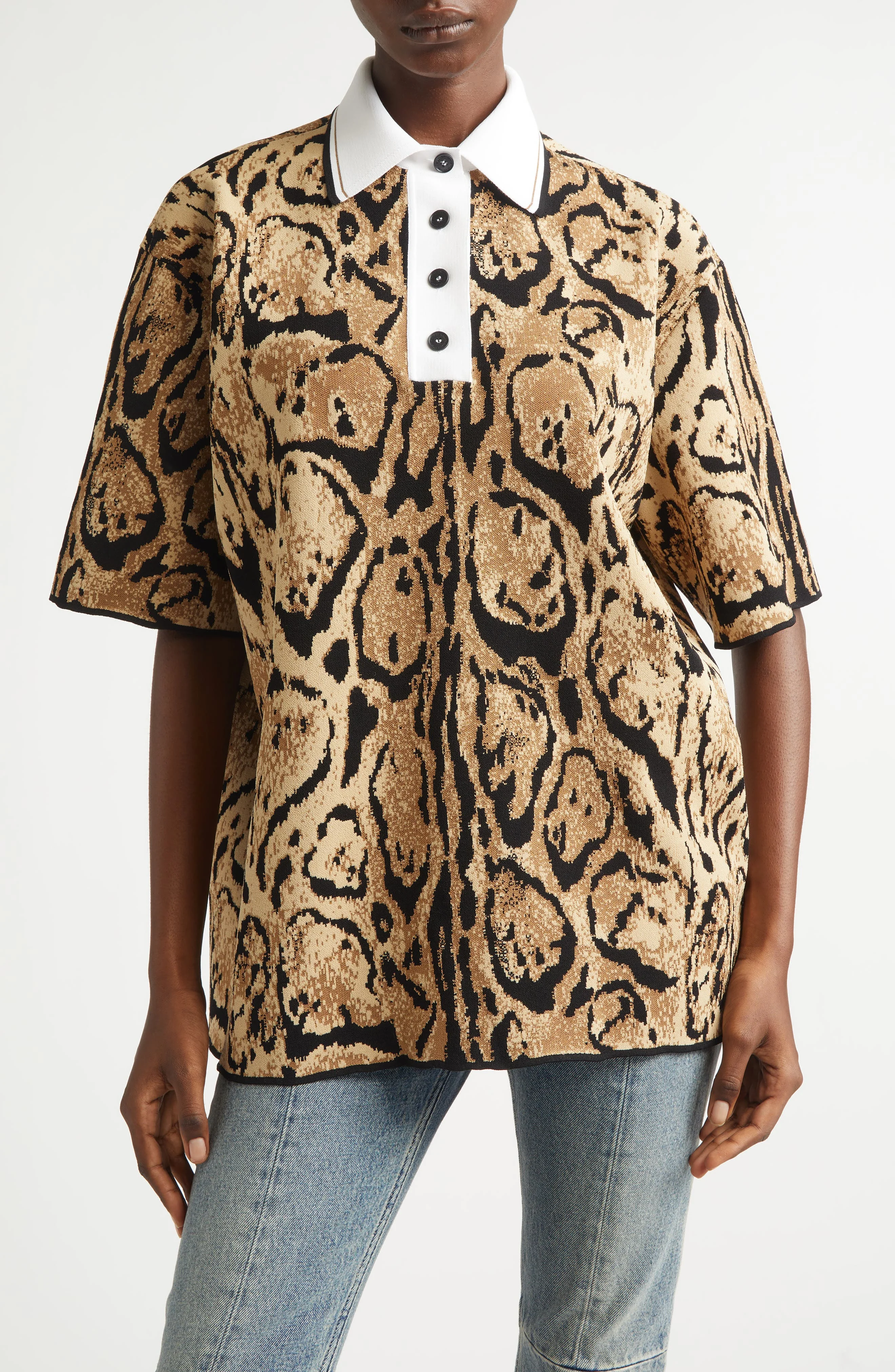 Walk on the wild side with this clouded leopard jacquard polo-sweater from the designer's resort '26 collection. The relaxed silhouette is rugby inspired, with a contrast tipped collar and placket. Button half placket Point collar Short sleeves 80% viscose, 10% polyester, 9% polyamide, 1% elastane Dry clean Made in Italy Designer Clothing