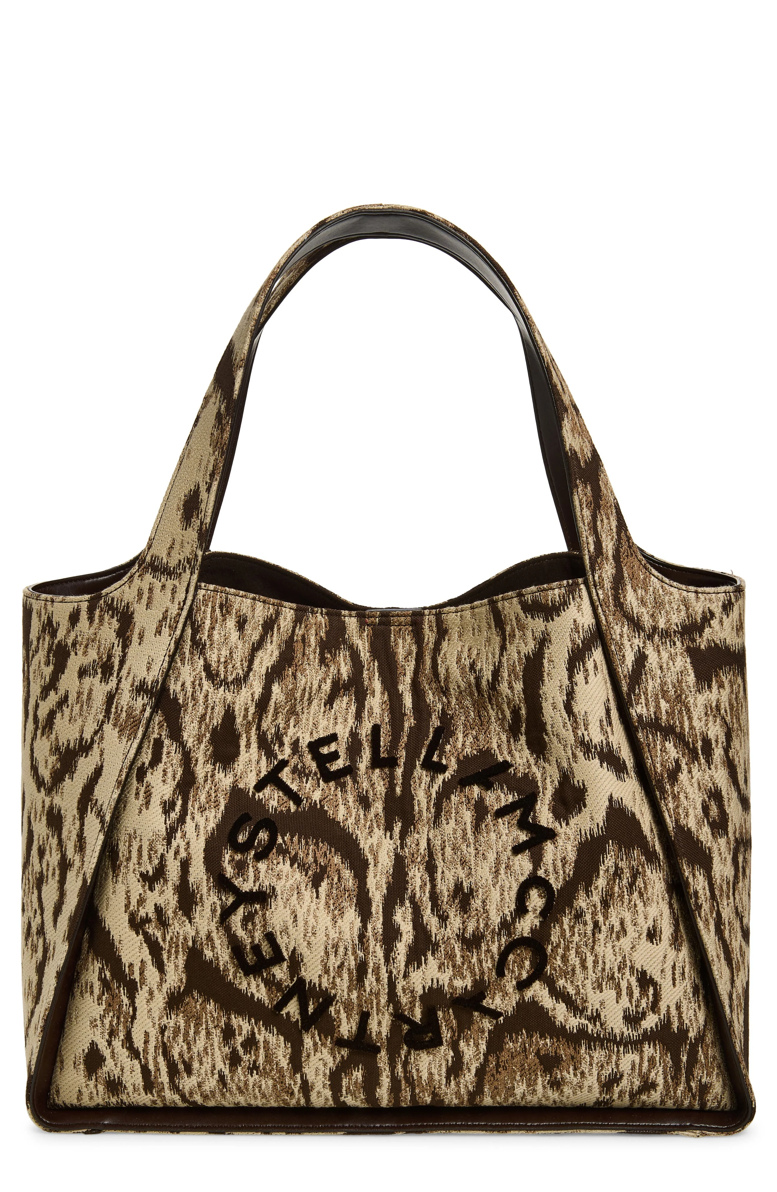 Stella's circular logo makes the rounds in delicate embroidery on this richly textured cotton tote clouded with leopard-inspired spots. A tethered leather pouch helps keep small items organized and secure. Open top Shoulder straps Removable tethered snap-flap pouch Structured silhouette with flat base for stability Textile Made in Italy Designer Handbags