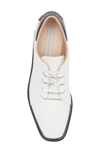 A sporty faux-leather sneaker from Stella McCartney features a perforated-logo at the heel collar, a chunky, striped platform and a sawtooth-edged rubber sole. 3 1/2" (89mm) heel; 2 1/2" platform (size 8.5US / 38.5EU) Synthetic upper, lining and sole Made in Spain Women's Designer Shoes