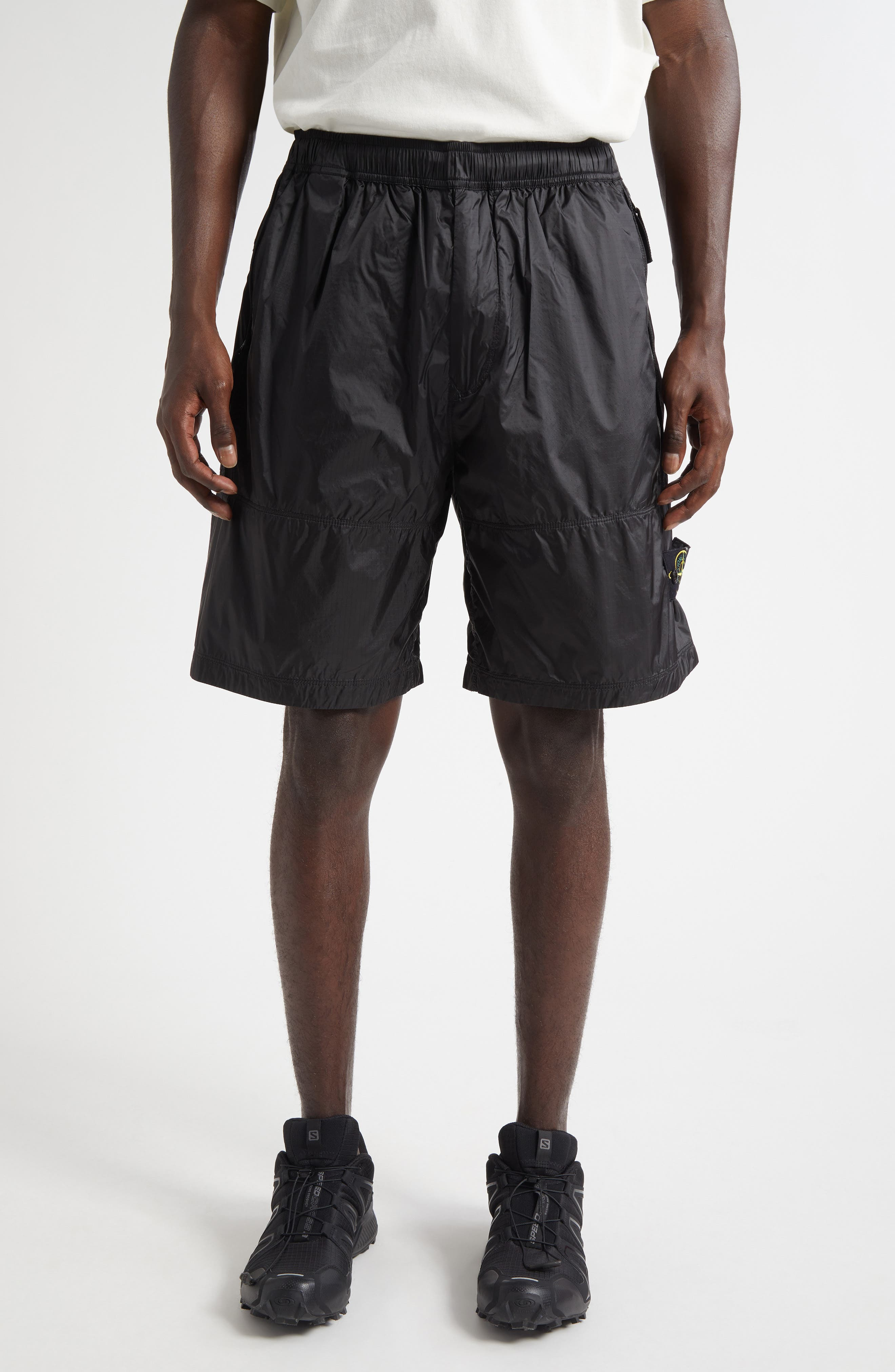 Stone Island's adventure-ready aesthetic comes to life in the utility style and military-inspired compass logo defining these lightweight nylon shorts. Elastic waist Vertical side-zip pockets 100% polyamide Dry clean Imported Designer Clothing