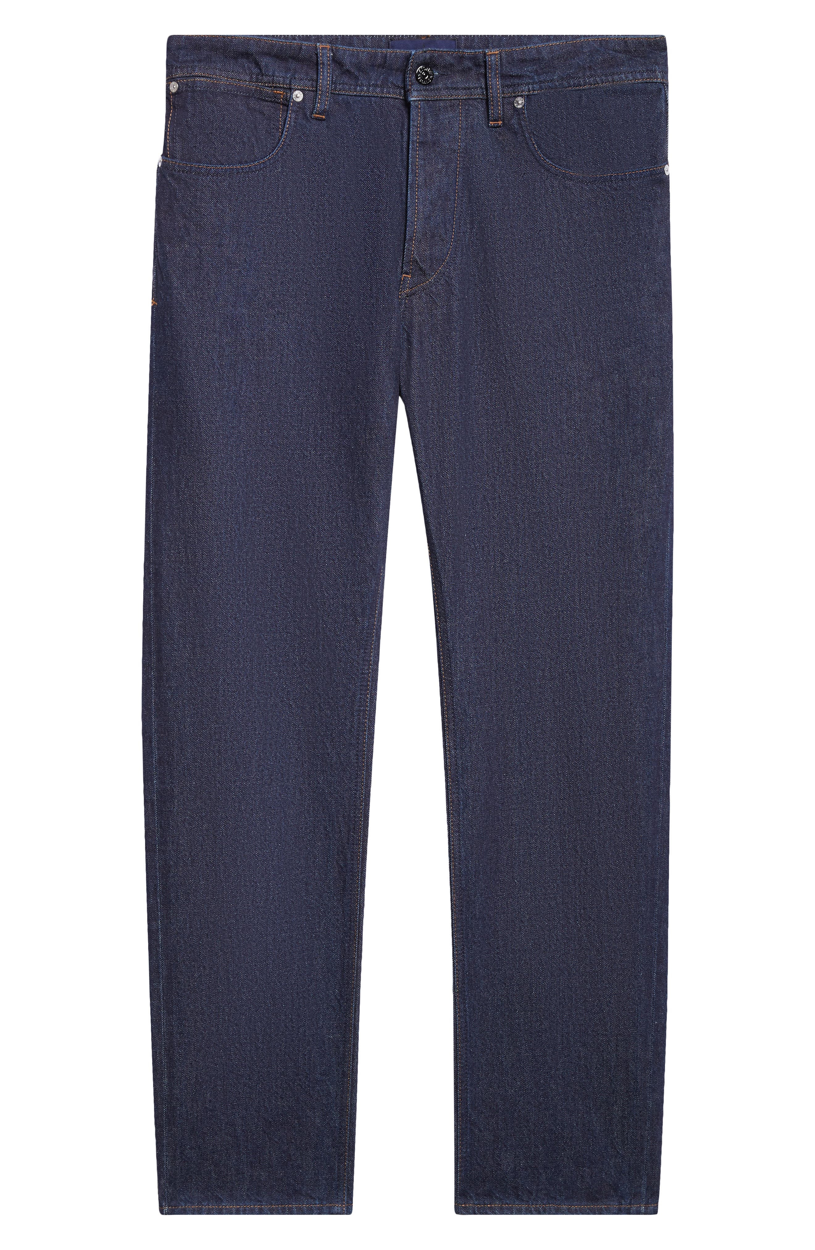 Classic for a reason, straight leg jeans detailed with tobacco-hued topstitching are cut from rigid denim in an indigo wash that's been rinsed for a worn-in look. Zip fly with button closure Five-pocket style 100% cotton Machine wash, line dry Imported Designer Clothing