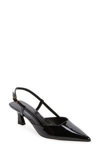 A pointy toe and sculptural flare heel balance a glossy pump fashioned with an adjustable slingback strap for a secure fit. 1 3/4" heel Adjustable slingback strap with buckle closure Synthetic upper/leather lining and sole Made in Spain
