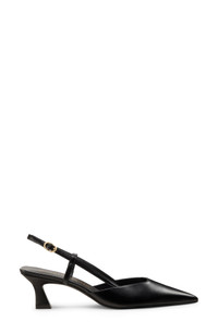 A dramatically pointed toe balances the slender slingback strap wrapping a pump lifted on a gracefully flared kitten heel that anchors the geometric footprint. The sleek, low silhouette makes an effortless complement to elevated-casual looks and smartly tailored outfits alike. 1 3/4" heel Adjustable slingback strap with buckle closure Leather or textile and synthetic upper/leather lining and sole Imported