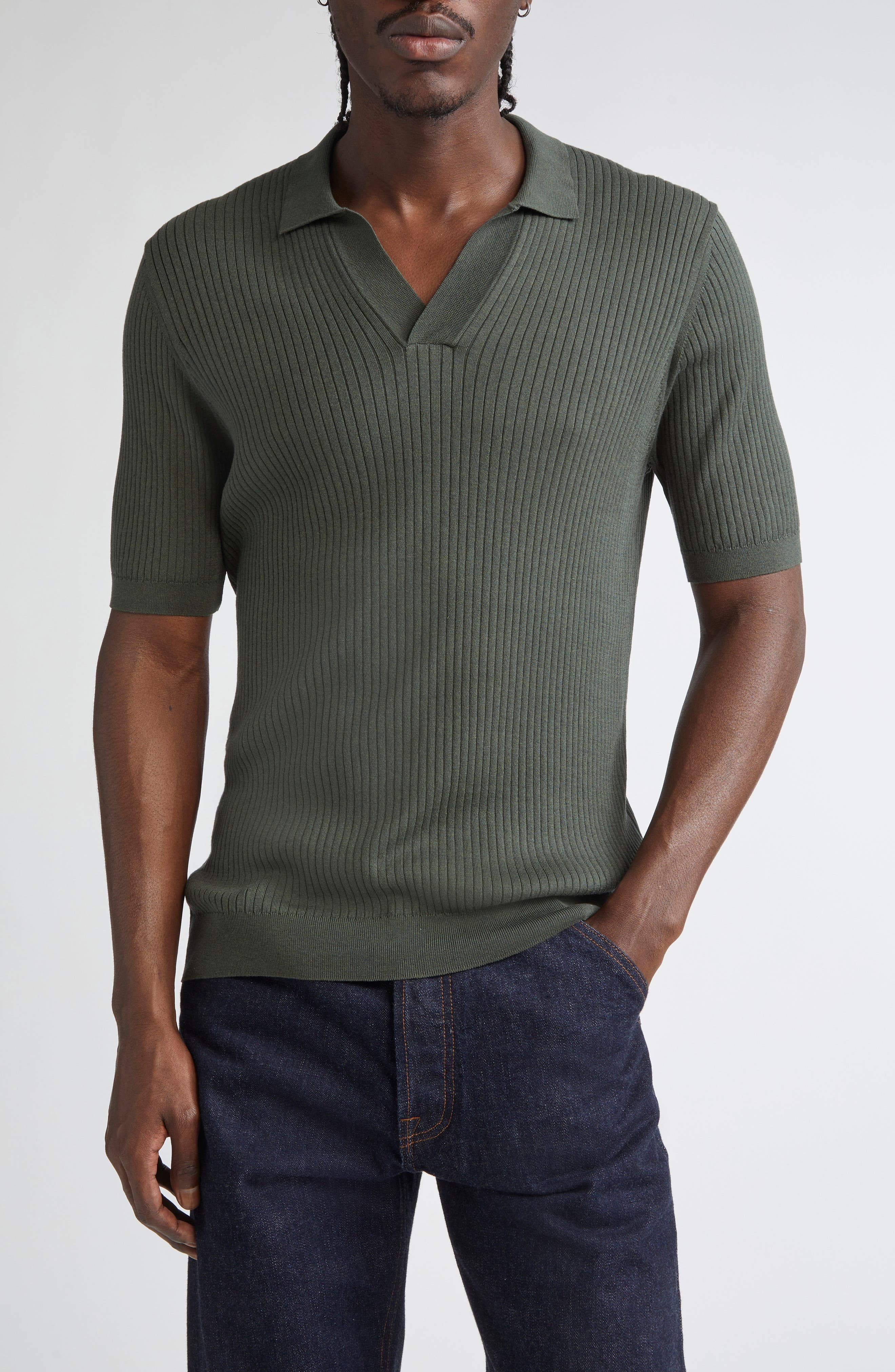 The renowned British label has elevated the wardrobe-staple polo with this rib-knit version crafted for softness from a blend of silk and cotton. 26 1/2" length (size Medium) Button half placket Spread collar Short sleeves 55% silk, 45% cotton Dry clean or hand wash, dry flat Made in Portugal Designer Clothing