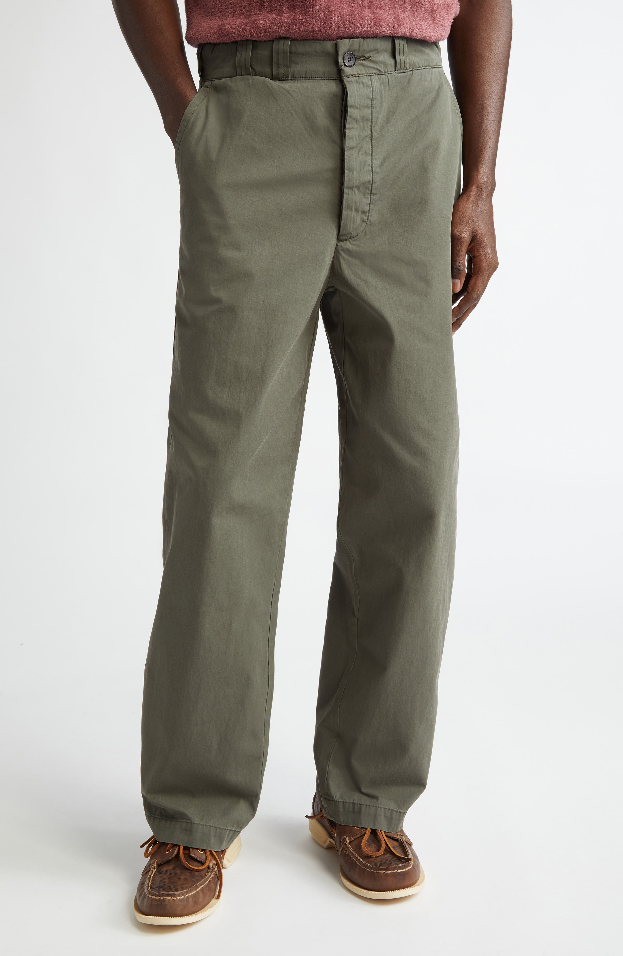 Embodying the laid-back spirit of California surf culture, these versatile workwear pants are crafted from durable Italian cotton and feature a wide-leg design. Zip fly with button closure Front slant pockets; back button-welt pockets 100% cotton Machine wash, line dry Made in the USA Designer Clothing